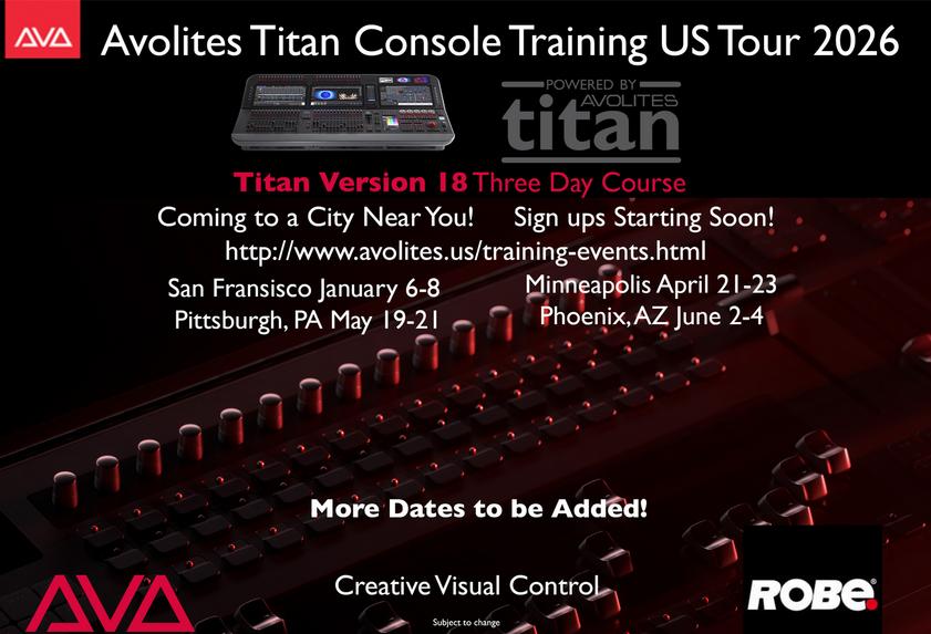 Avolites Titan training 3 days of complete on console training. Paid attendees receive a T1 USB DMX interface providing 1 DMX output of Titan software to take home. USB DMX interface is fully functional no time limit.